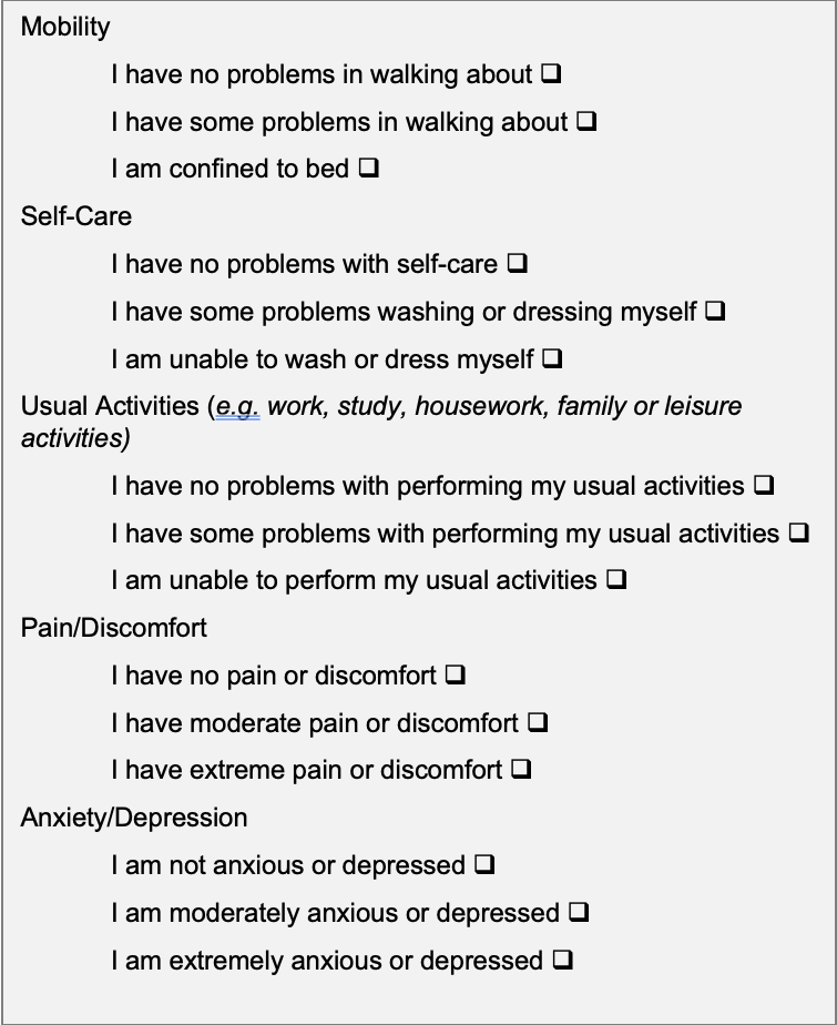 5 domains: mobility; self-care; usual activities; pain/discomfort; and anxiety/depression