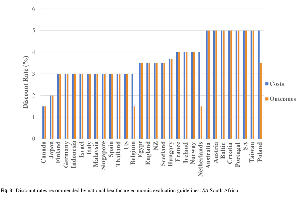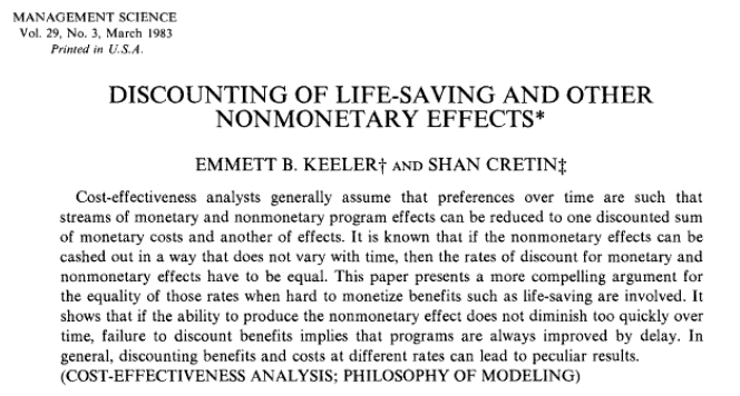 Imagine that an intervention would cost $100,000 and yield a 1 QALY benefit. If we discount costs at 3% per year but don’t discount QALYs…